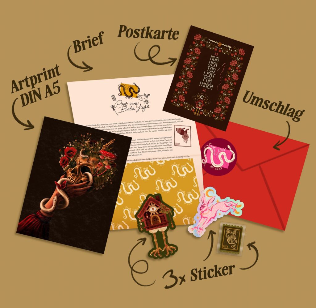 Die SNAKE MAIL ist eine Sammlung von gedruckten Artworks, Goodies und einem Brief voller Hintergrundinfos für dich, direkt in deinen Briefkasten geliefert. Für jede Edition der SNAKE MAIL suche ich mir ein neues Thema aus und gestalte die Prints, Sticker usw. dafür.